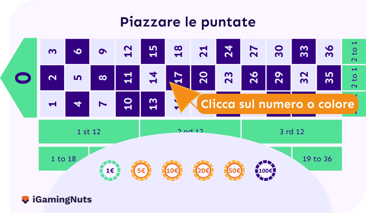 A livello visivo, il tavolo ha una tabella dallo 0 al 36, disposti in ordine crescente. In alto c’è lo 0, in una cella che occupa 3 colonne.