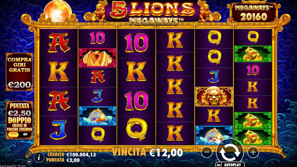 Per esercitarti, puoi fare pratica con la demo di 5 Lions Megaways slot che trovi a inizio pagina.