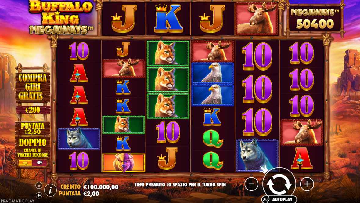 Nella slot Buffalo King Megaways si trovano simboli tematici come bufali, coyote, lupi, aquile e puma, tutti animali tipici del canyon americano.