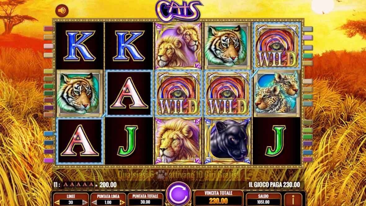 Se vi piacciono i grandi felini come pantere, leoni e leopardi e ancora non avete provato Cats, qui sopra potete giocare con la slot gratis in demo. Per il resto, vi offro cinque validi motivi per giocare alla slot Cats: