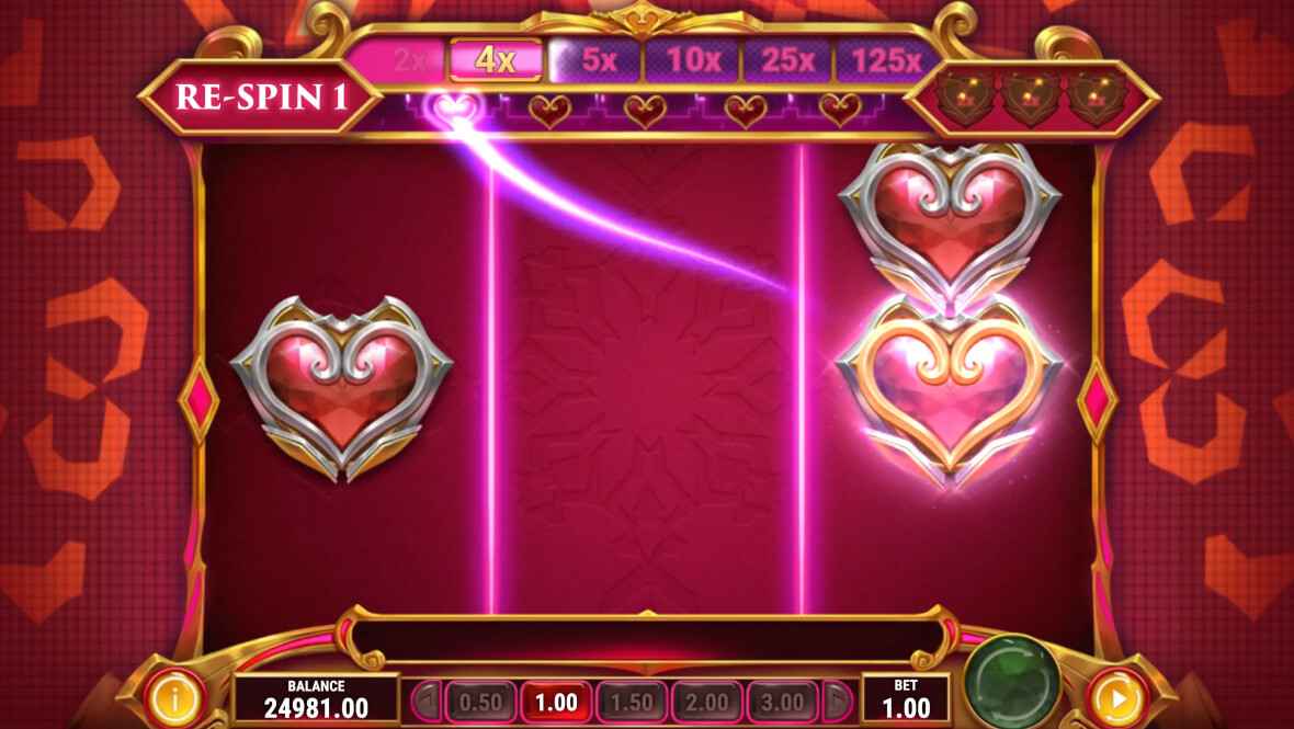 - Quando un joker si ferma sul display, sul rullo centrale, si attivano i Love-respin (giri gratis), dove appaiono dei cuori che fanno salire i moltiplicatori fino a 125x. Tuttavia, sulla parte destra vi sono altri tre “2x” e ciò significa che possono salire fino a 250x, 500x e 1000x.