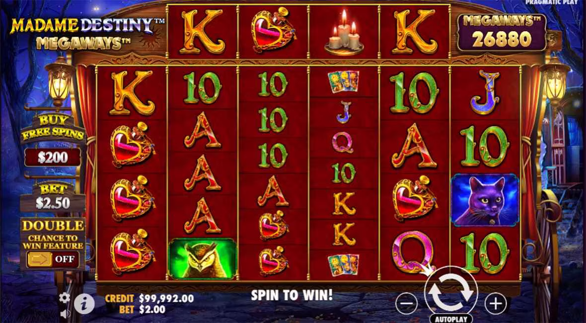 Madame Destiny Megaways è una slot Pragmatic Play del 2018. Possiede alta volatilità, un buon RTP del 96,56%, 200.704 modi per vincere, rulli a cascata e una funzione bonus free spins con moltiplicatori.