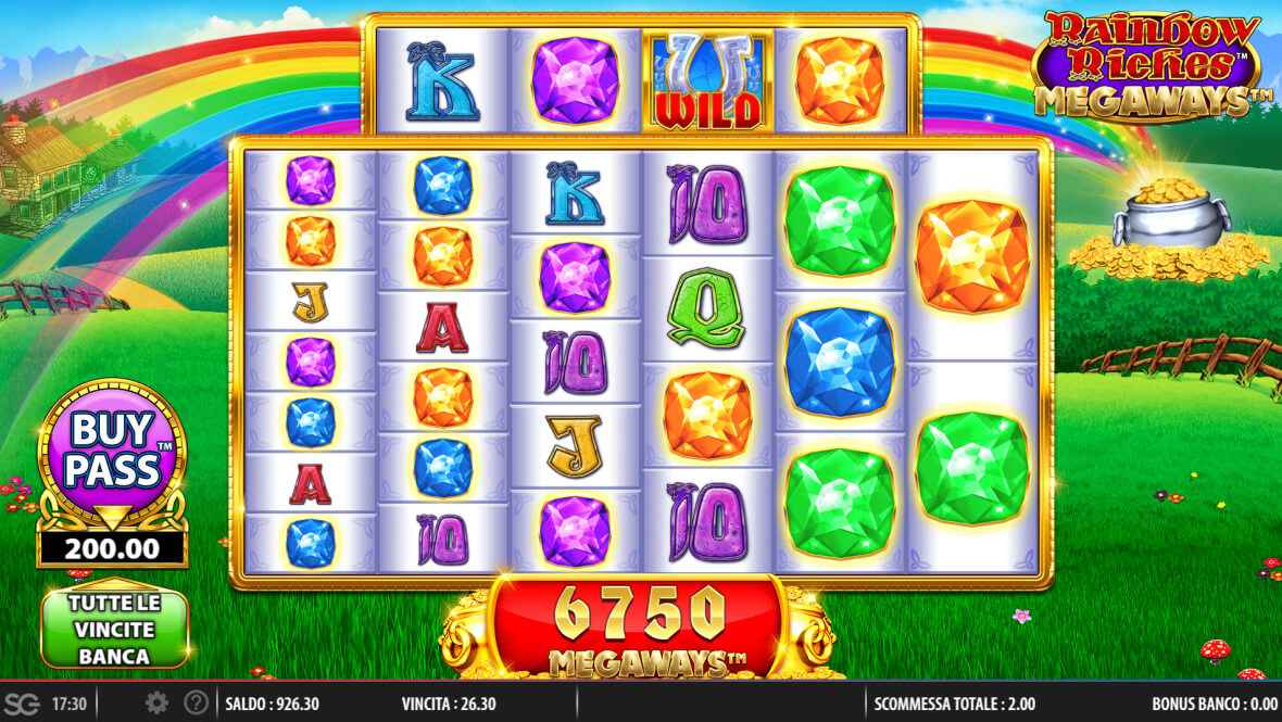 - Buy Pass: versione semplificata delle slot Bonus Buy, Rainbow Riches Megaways permette di pagare un tot di volte la puntata base per acquistare le funzioni bonus, “forzando” la fortuna.