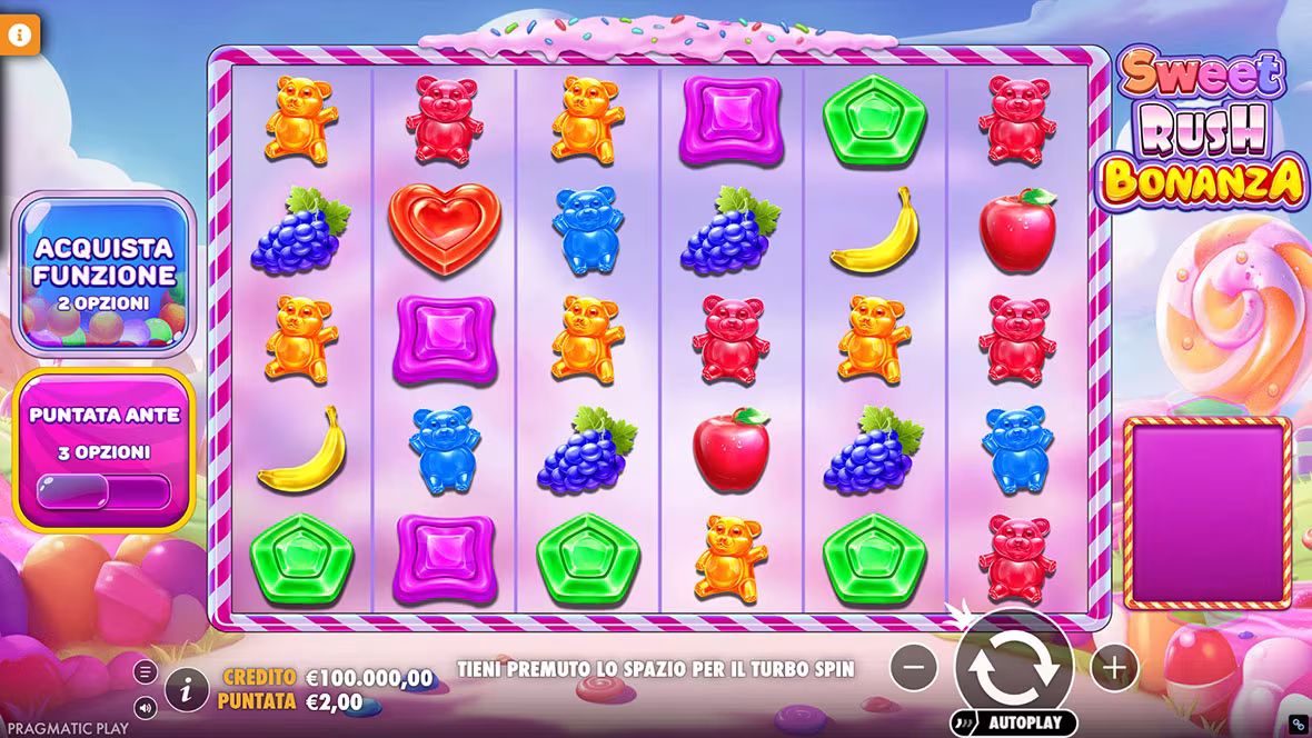 Sweet Rush Bonanza offre diverse modalità bonus e opzioni extra che rendono il gioco molto dinamico e adatto a chi cerca varietà e potenziale di vincita elevato.