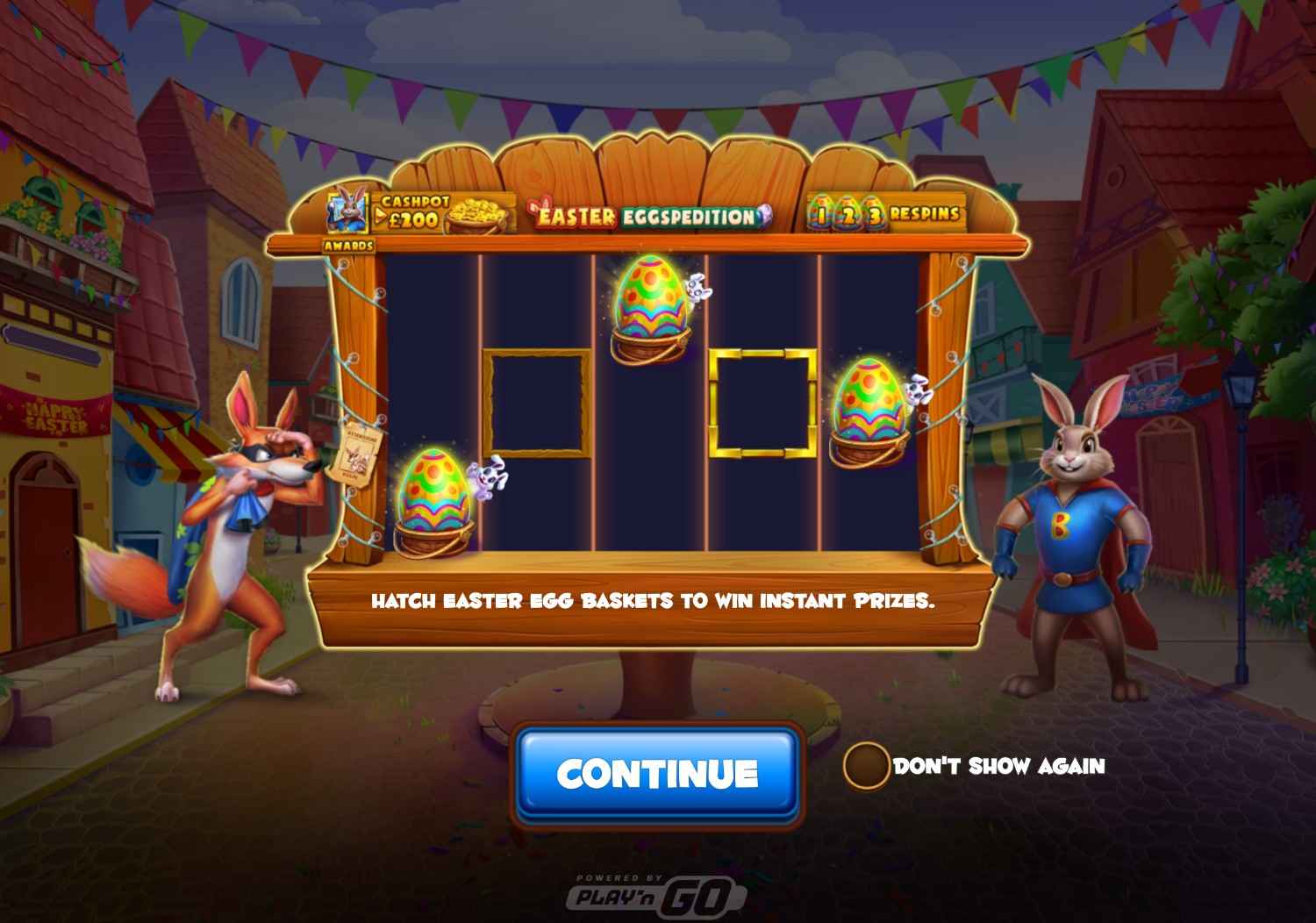 Three or more Easter Egg Basket scatter symbols trigger the bonus feature. Three respins are awarded to start, and Easter Egg Baskets landing during the feature award either Instant Prizes or Multipliers. Instant Prizes accumulate in the Cash Pot; Multipliers multiply the total Cash Pot value. The feature ends when three consecutive respins pass without a Basket or Bunny landing, at which point the Cash Pot is awarded or reset depending on which character appears last.