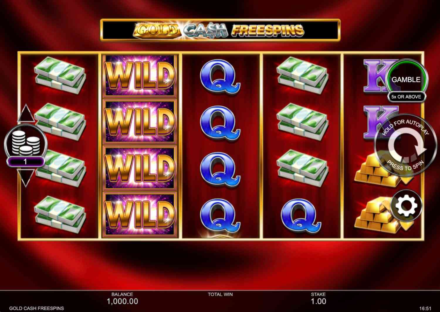 The maximum win in Gold Cash Free Spins is 1,116x your bet. The most direct route to the top end is through the free spins round, where the gold bar symbols dominate the grid and the wild can appear on reels 2, 3 and 4 to complete combinations. The gamble feature can accelerate winnings from a single triggering spin, but carries the risk of wiping the payout entirely.